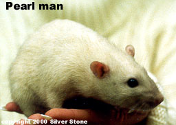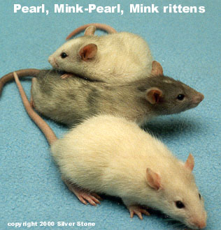 Witte vacht met grijze haarpunten (pareling), door de korte haartjes bij de neus duidelijker ticking (donkerder) en donkerbruin tot zwarte ogen.