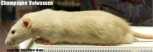 Licht creme tot beige, soms met rossige gloed, buikkleur lichter beige, rode ogen.